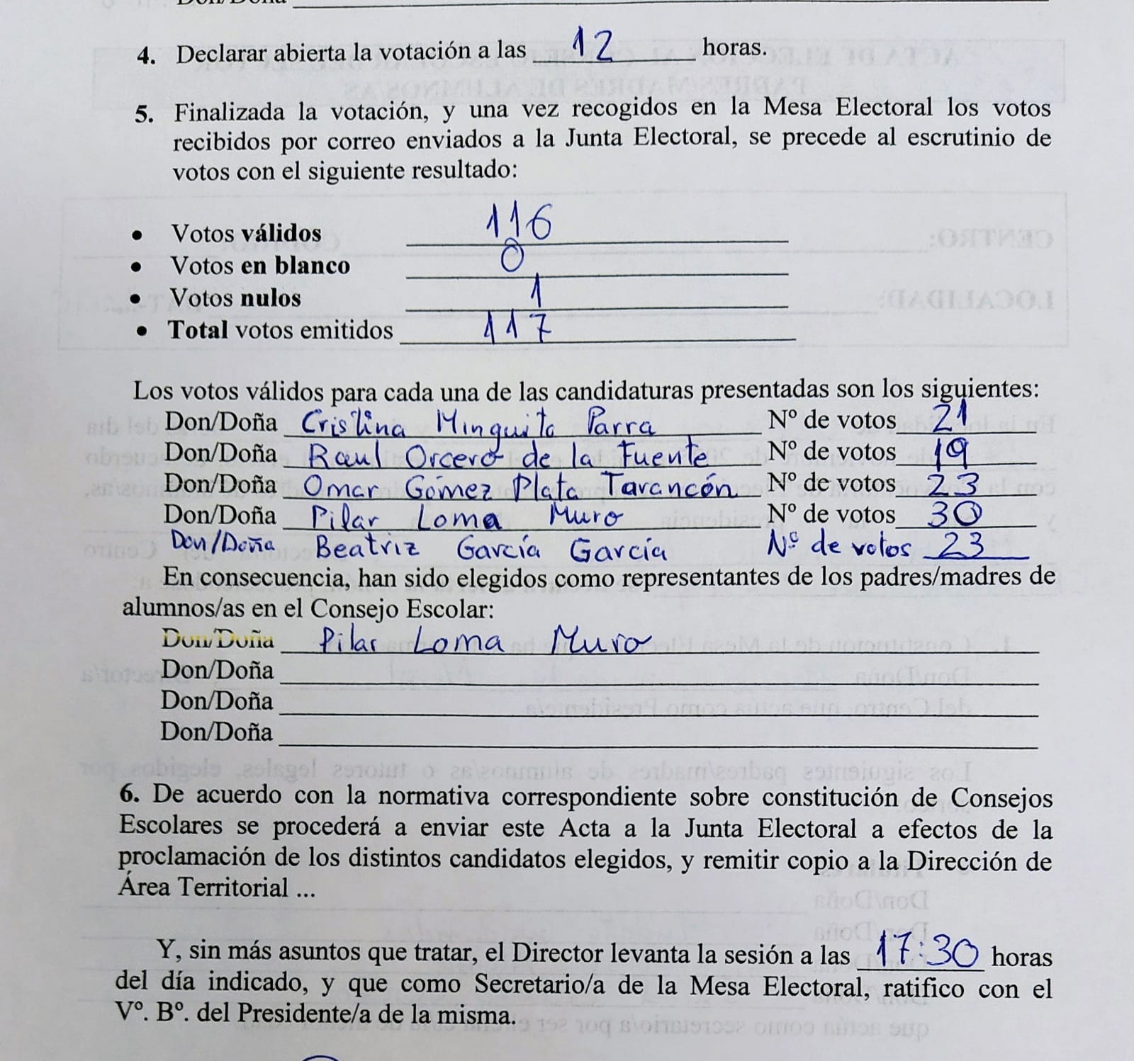 demás que hayan obtenido votos. Dicha acta será enviada a la Junta Electoral, a efectos de proclamación de los distintos candidatos elegidos, remitiendo copia a la Dirección de Área Territorial Madrid Norte.